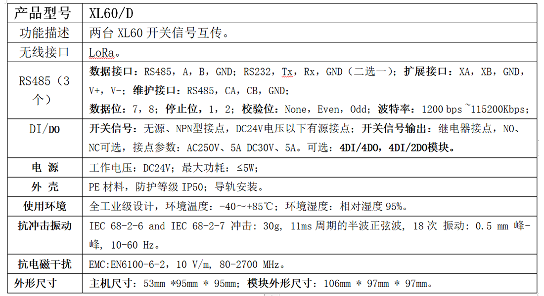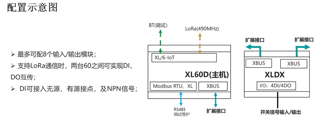 XL60D的通信方式是LoRa無線傳輸方式,每臺XL60D主機(jī)模塊,最多配兩個(gè)開關(guān)量I/O模塊。
