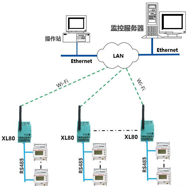 1、安裝在配電柜(控制柜)的電能表,通過RS485總線接入XL80智能主機;建議同一面(如)柜內的電能表,配置1臺XL80智能主機,智能主機也安裝在配電柜內;