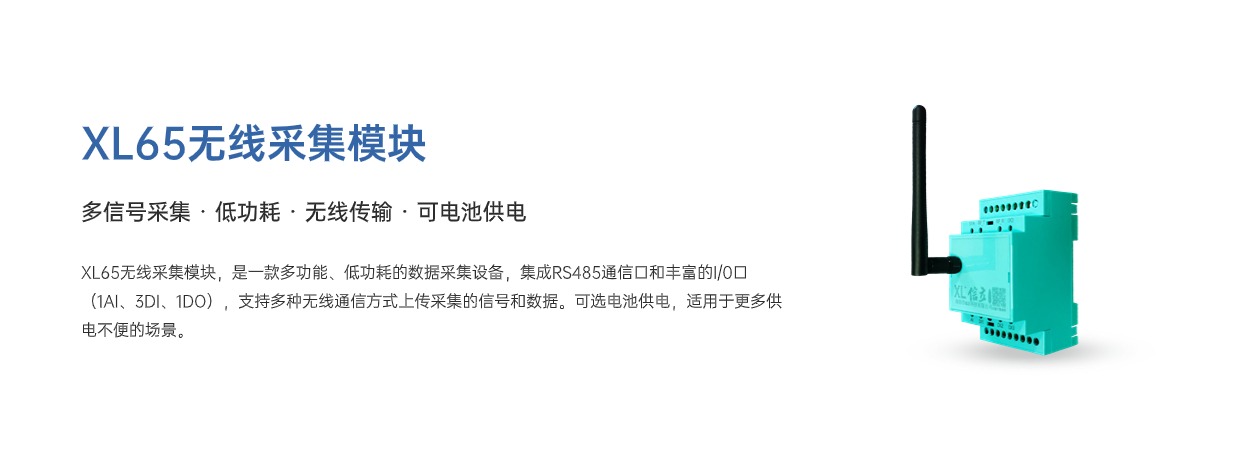 XL65采集模塊,用于監(jiān)測(cè)點(diǎn)分散、數(shù)量少、供電不方便的場(chǎng)景。電池供電,變位、超限觸發(fā)功能,更適用于變送儀表信號(hào)、開(kāi)關(guān)接點(diǎn)信號(hào)采集。