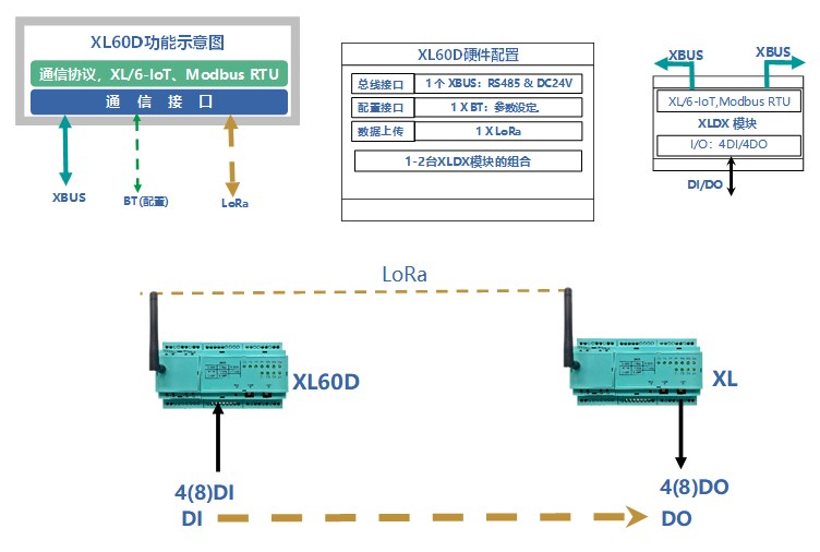 XL60D的通信方式是LoRa無線傳輸方式,每臺XL60D主機(jī)模塊,最多配兩個開關(guān)量I/O模塊。