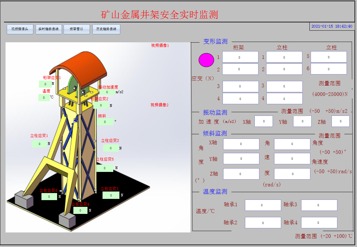 基于XIoT技術(shù)的煤礦井架安全實時監(jiān)測系統(tǒng),實時監(jiān)測井架環(huán)境參數(shù)。當(dāng)參數(shù)異常或出現(xiàn)險情時,中控室發(fā)出報警聲提醒工作人員。 1)需提供攝像頭實時監(jiān)測井架周邊情況 ; 2)實時監(jiān)測井架受力情況、振動情況、傾斜情況及軸承溫度情況; 3)PC界面可實時查看數(shù)據(jù)信息,數(shù)據(jù)存儲不少于180天。監(jiān)控系統(tǒng)簡述: