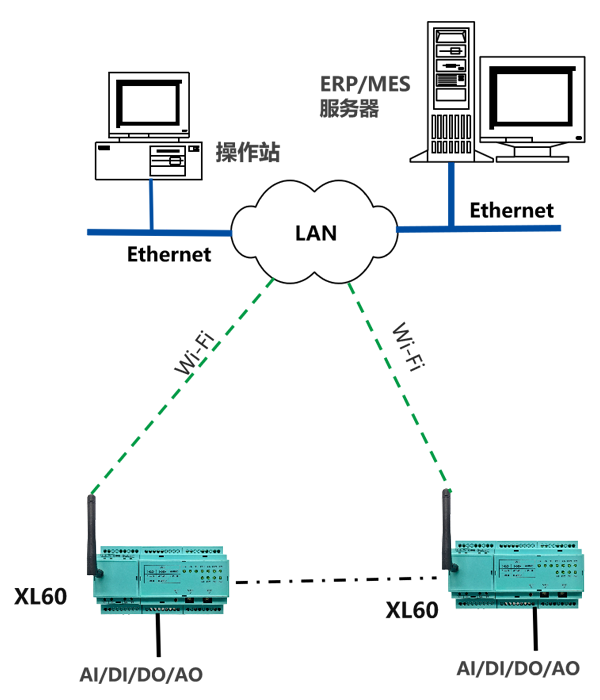 應用場景:工廠車間有獨立的工業據數據Wi-Fi網絡,或是Wi-Fi網絡可用于傳輸數據;采集車間機器設備運行信號、工藝參數(溫度、壓力、位移、轉速、計數、產量......),通過LAN直接推送數據至監控服務器;