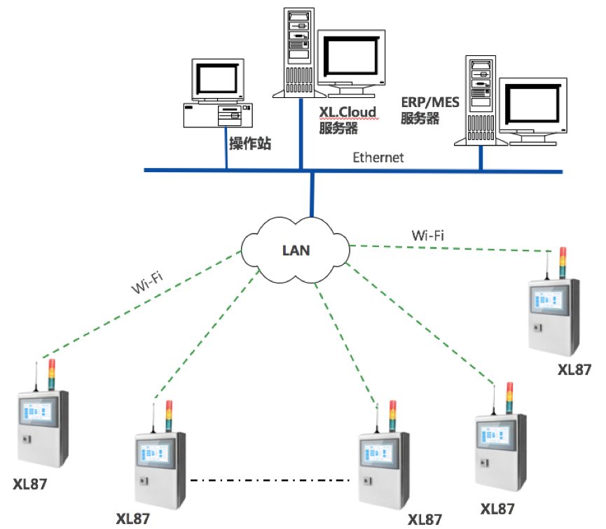 系統由數據采集節點裝置XL87智能采集終端 、Wi-Fi無線通信網絡、監控中心服務器,及工廠數字化平臺XL.Cloud軟件構成;