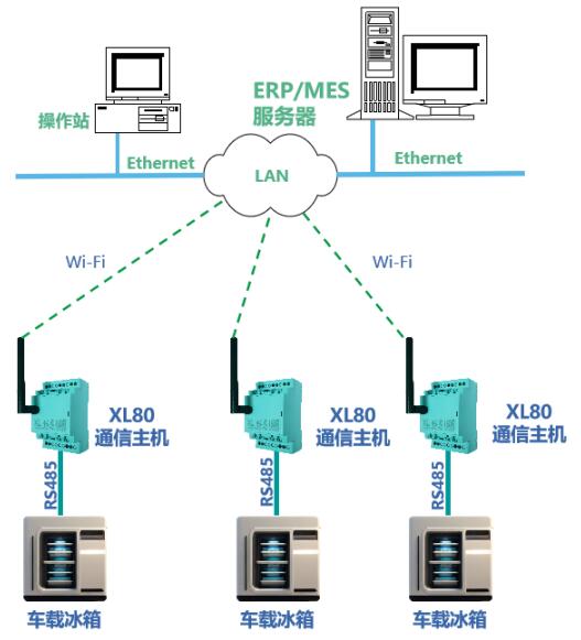 綜合考慮現(xiàn)場監(jiān)測需求,選用 XL802 通信主機(jī) ,通過 RS485 采集冰箱壓縮機(jī)、加熱塊、風(fēng)扇等部件的電壓、電流等電氣參數(shù),進(jìn)行 協(xié)議轉(zhuǎn)換 并 無線遠(yuǎn)傳 。可通過 XBUS 總線, 擴(kuò)展信號(hào)輸入、輸出模塊 ,滿足現(xiàn)場較多參數(shù)采集的情況。