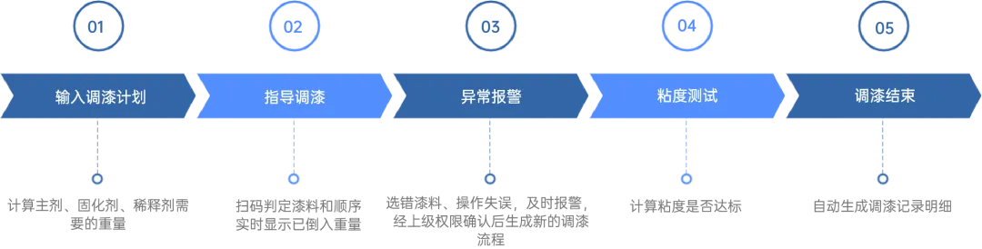 l 實現調漆過程可追溯,記錄每一步調漆操作、質量、用料等,出現異常能快速定位問題;