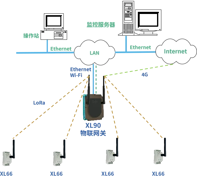 XL66串口無線轉換模塊通過LoRa將數據無線傳輸至XL90物聯網關,網關通過以太網、Wi-Fi上傳數據至監控平臺、PLC、觸摸屏、控制器等設備,或通過4G無線上傳數據至云平臺。